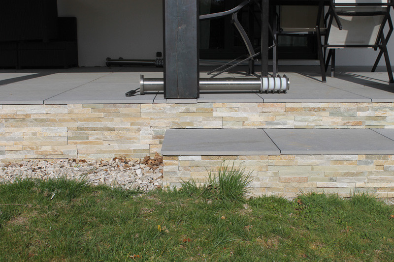 Création d’une terrasse surélevée en dalles avec parement en pierre naturelle – Pose et aménagement extérieur par AK Rénovation dans le Pays de Gex